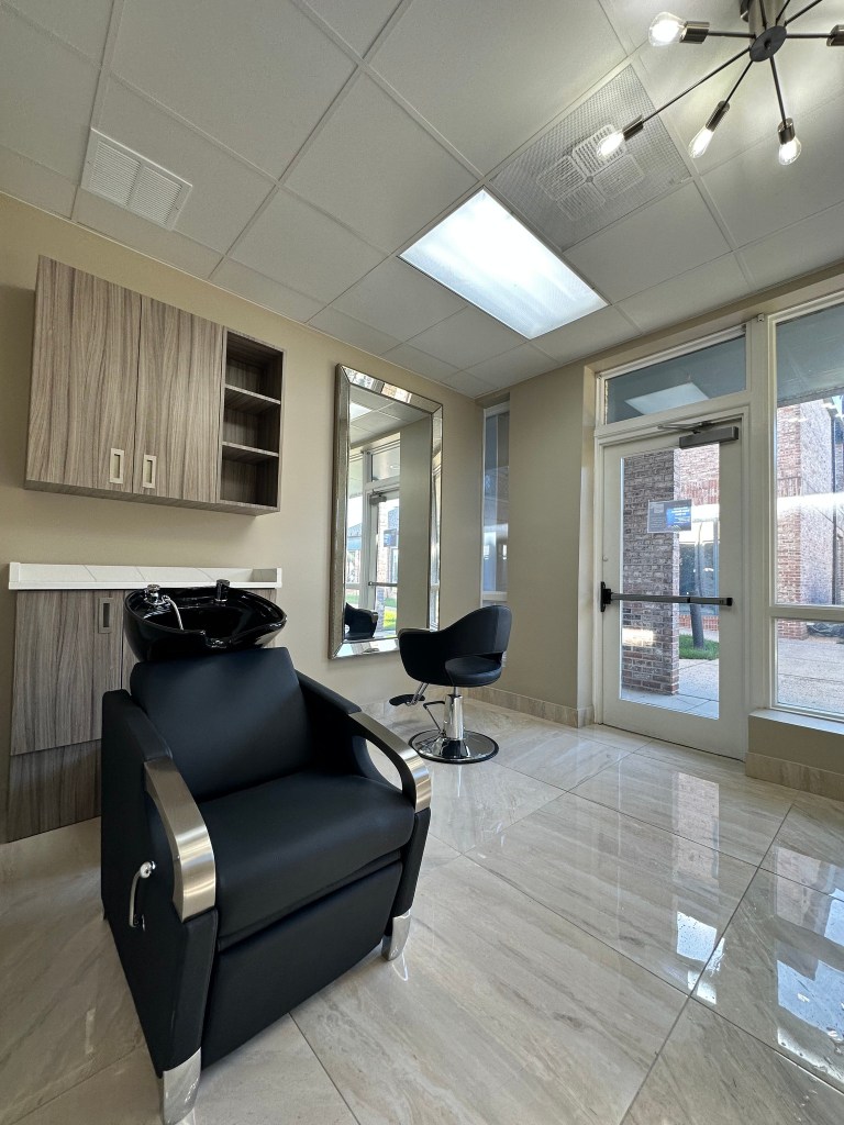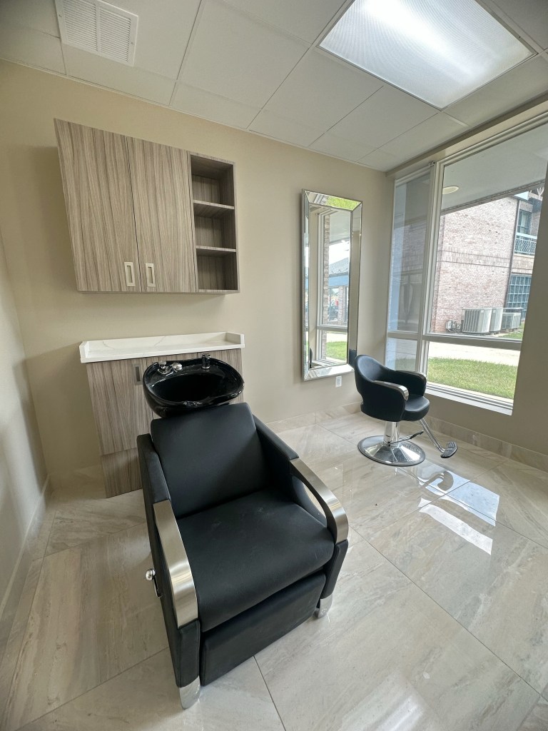 - Each studio is provided with a professional styling chair, large mirror, shampoo chair & bowl, display cabinets, workspace with beautiful stone countertop, coat/purse hanger, auto sensing LED lighting in the ceiling and a user controllable LED chandelier.